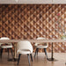 Each layered mosaic pattern also adds subtle acoustic softness, helping to break up sound reflections for a more comfortable room environment. The combination of solid wood texture and geometric depth makes this panel not only visually stunning but functionally smart.